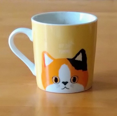 右手でカップを持つと、猫が向こう側になっちゃう。