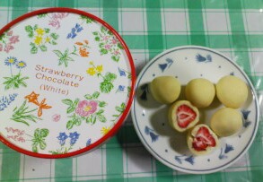 ヨーグルト味のホワイトチョコの真ん中に、ドライフルーツになったイチゴがまるまる1個入っている。