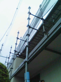 まず足場を組むところから。雨の中、2時間ほどで足場完成。