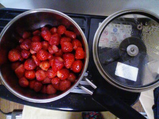 ジャム用苺1パックなんと98円!を見つけ、3パック(しか買えなかった)をどっと鍋に入れ。
