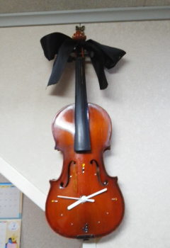 振り向かなくても時間がわかるように、前から時計の欲しかった場所があったのだが、ヴァイオリンの時計というアイデアをふと思いついて温めていたもの。