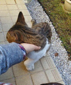 物音に怯える風はあるのだが、私が座って待っていると、向こうからやって来て、今日は触らせてくれるまでになった。
