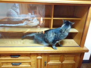 食器を出した後に探検する千代とそれを眺めるたま(ガラスに映ってる)。