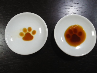にゃんと、お醤油を差すとくぼみに肉球が現れるという小皿。