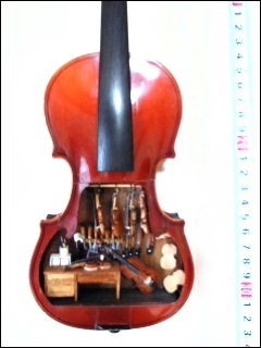 フレームは本物のヴァイオリン。10分の1サイズ。