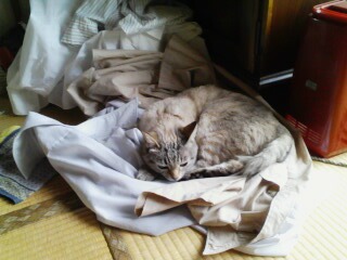 先日などは、急いで取り込んで放置していたシーツに包まっていて、