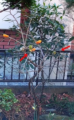 みかんを刺してやると、まっさきに来るのはヒヨドリ。