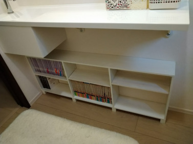 前々から暇になったら作ろうと思っていた、トイレの手洗いカウンター下の物入兼本箱。